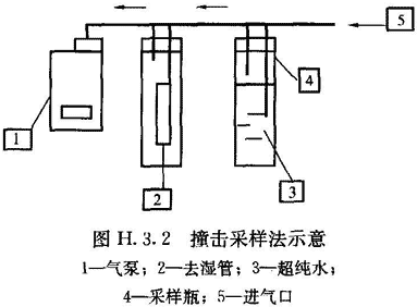2 采樣瓶內(nèi)注入30mL超純水,用管子按圖H.3.2所示將各部分連接起來。去濕管是為了保證沒有水滴被吸入采樣泵。