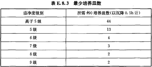 7 培養(yǎng)皿數(shù)應(yīng)不少于微粒計數(shù)濃度的測點數(shù),如工藝無特殊要求應(yīng)大于等于表E.8.3中的最少培養(yǎng)皿數(shù),另外各加1個對照皿。