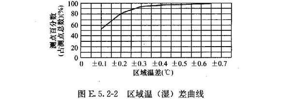 區(qū)域溫差、區(qū)域相對濕度差:按測點中最低或最高的一次測定值與各測點平均溫度和平均相對濕度的差值的測點數(shù),占測點總數(shù)的百分比,整理成累計統(tǒng)計曲線(圖E.5.2—2)。