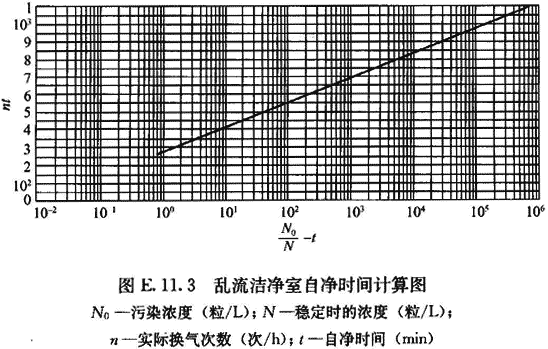 E.11.3 由測得的開機前原始濃度或發(fā)煙停止后1min的污染濃度(N0)、室內(nèi)達到穩(wěn)定時的濃度(N)和實際換氣次數(shù)(n)查圖E.11.3,得到計算自凈時間,再和實測自凈時間進行對比。