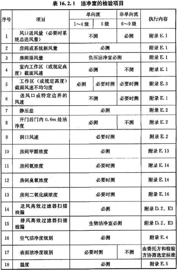 16.2.1 潔凈室在高效過濾器現(xiàn)場檢漏后的必測項目,應(yīng)符合表16.2.1的要求,也可由該表選擇選測項目。