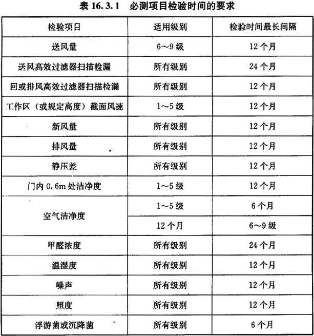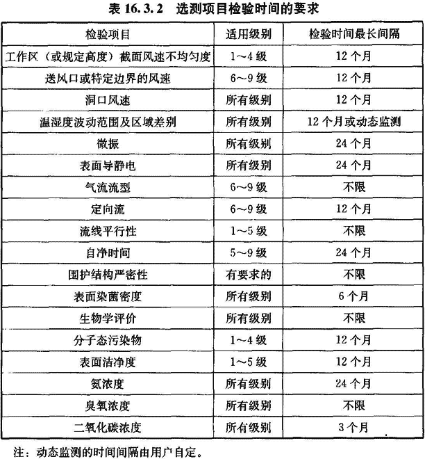 16.3.2 在工程驗收后為確認(rèn)潔凈室的選測項目符合要求的日常檢驗(不含臨時抽測)周期可按表16.3.2確定。