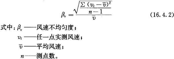 16.4.2 當(dāng)需對室內(nèi)單向流品質(zhì)作細(xì)致確認(rèn)時,可測工作區(qū)(或規(guī)定高度)截面風(fēng)速不均勻度。風(fēng)速不均勻度應(yīng)按附錄E檢驗,并按下式計算,結(jié)果不應(yīng)大于0.25。