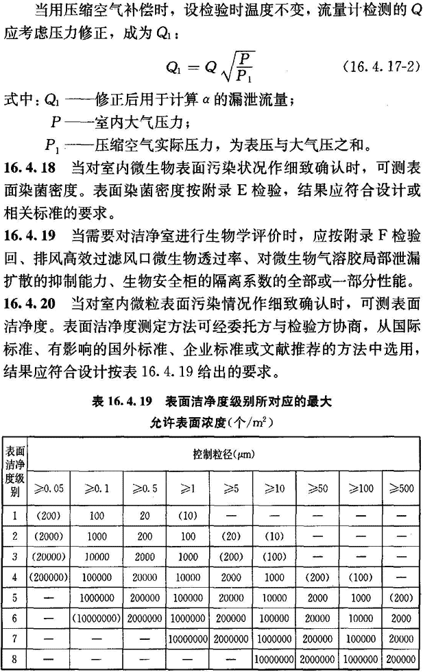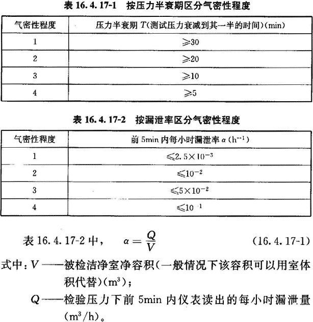 16.4.17 當(dāng)對潔凈室的嚴(yán)密性有特殊要求時,可測其圍護結(jié)構(gòu)嚴(yán)密性。圍護結(jié)構(gòu)嚴(yán)密性按附錄G檢驗。檢驗結(jié)果應(yīng)符合設(shè)計要求。當(dāng)設(shè)計無明確要求時,可在以下兩表的任何一種評定方法中任選一種方法,兩表中最大測試壓力設(shè)定為500Pa。
