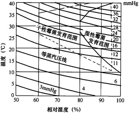 6.2.7、6.2.8 本節(jié)對圍護結(jié)構(gòu)內(nèi)表面抗菌涂飾工程進行了規(guī)定,由于在食品工業(yè)用房內(nèi)使用抗菌涂飾工程目前在國內(nèi)外意見不太統(tǒng)一,擔心抗菌產(chǎn)品會使食品中產(chǎn)生抗藥性菌株,但對于濕度經(jīng)常超過75%或有蒸汽作業(yè)的房間或關(guān)鍵區(qū)域的抗菌防霉問題,目前仍沒有更好的解決辦法,內(nèi)表面抗菌有很多方法,如消毒,但本規(guī)范僅對使用抗菌涂料的情況進行了規(guī)定。當相對濕度達到80%時,不論溫度高低,基本上都要發(fā)霉,見圖4,所以此時可涂防霉涂料。