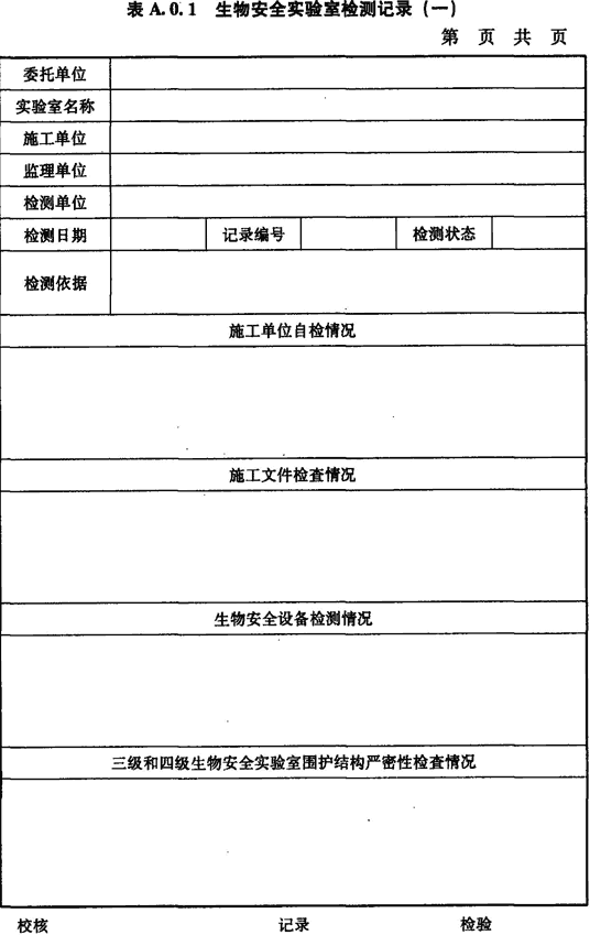 A.0.1 生物安全實(shí)驗(yàn)室施工方自檢情況、施工文件檢查情況、生物安全柜檢測情況、圍護(hù)結(jié)構(gòu)嚴(yán)密性檢測情況應(yīng)按表A.0.1進(jìn)行記錄。