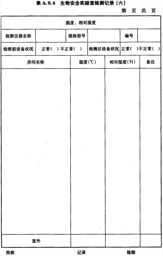 A.0.6 生物安全實(shí)驗(yàn)室房間溫度、相對濕度的檢測應(yīng)按表A.0.6進(jìn)行記錄。