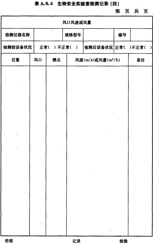 A.0.4 生物安全實(shí)驗(yàn)室風(fēng)口風(fēng)速或風(fēng)量的檢測應(yīng)按表A.0.4進(jìn)行記錄。
