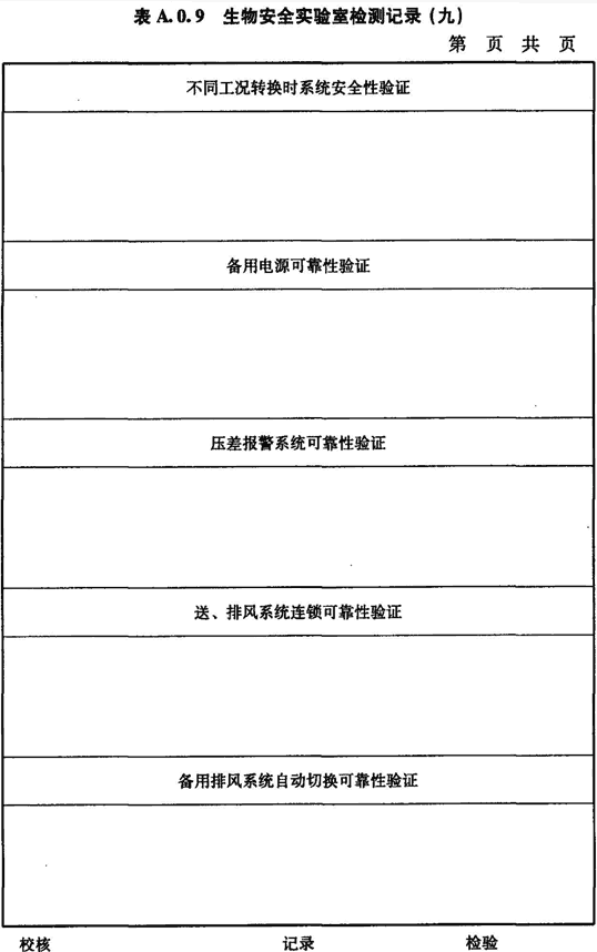 A.0.9 生物安全實(shí)驗(yàn)室配電和自控系統(tǒng)的檢測應(yīng)按表A.0.9進(jìn)行記錄。
