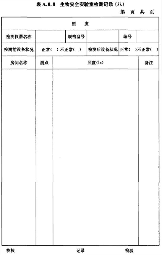 A.0.8 生物安全實(shí)驗(yàn)室房間照度的檢測應(yīng)按表A.0.8進(jìn)行記錄。