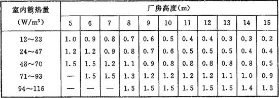 H.0.3 散熱量有效系數(shù)m值宜按相同建筑物和工藝布置的實(shí)測(cè)數(shù)據(jù)采用,當(dāng)無(wú)實(shí)測(cè)數(shù)據(jù)時(shí),單跨生產(chǎn)廠(chǎng)房可按下式計(jì)算: