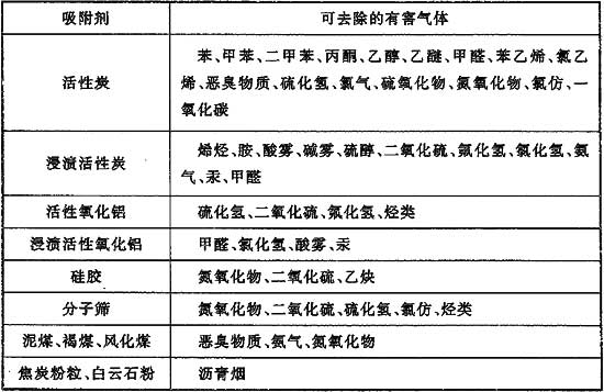 常用的吸附劑有活性炭、硅膠、活性氧化鋁或分子篩等?;钚蕴渴菓?yīng)用較廣泛的一種吸附劑,特別是經(jīng)浸漬處理后,應(yīng)用更加廣泛。硅膠等吸附劑稱為親水性吸附劑,用于吸附水蒸氣和氣體干燥。各種吸附劑可去除的有害氣體見表6。