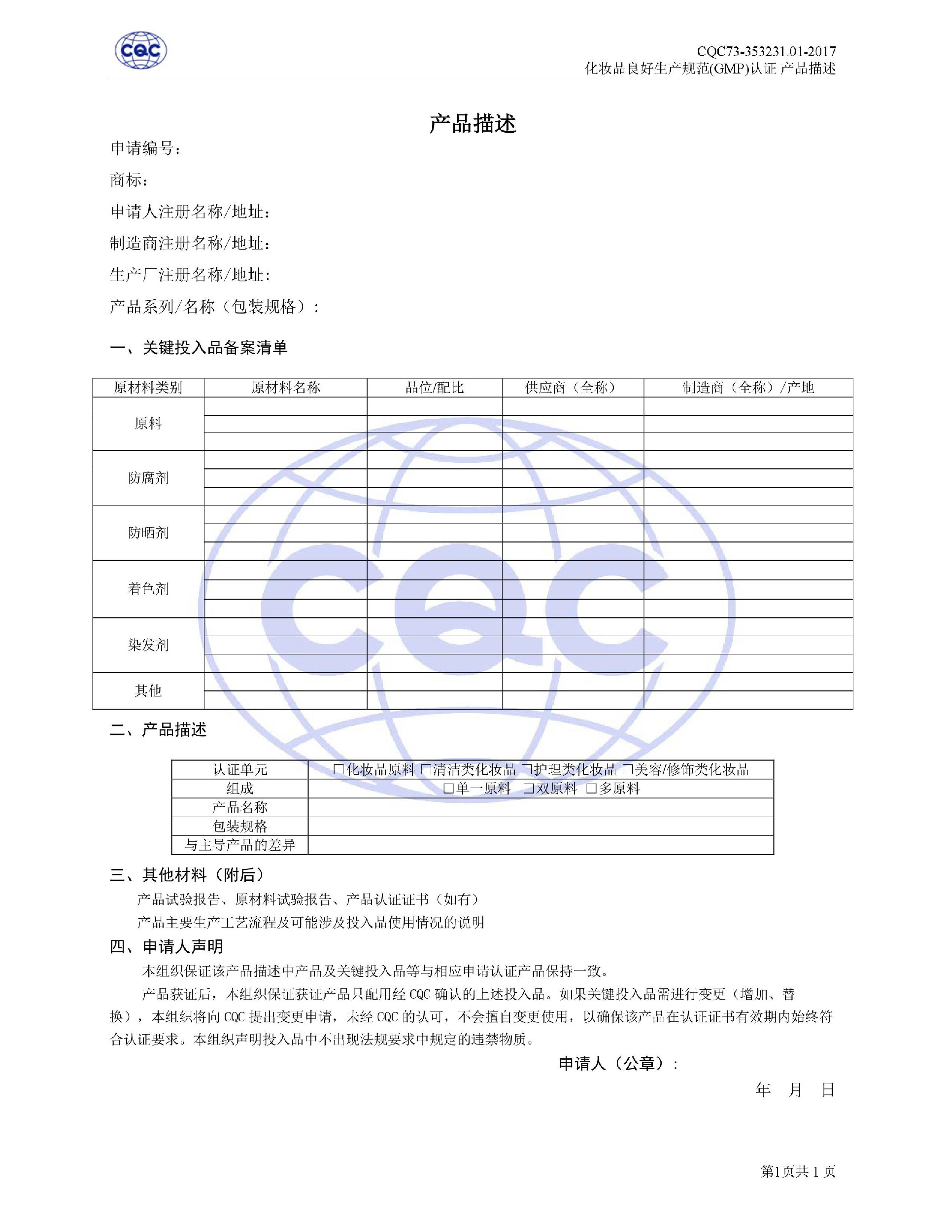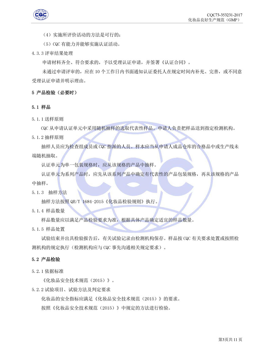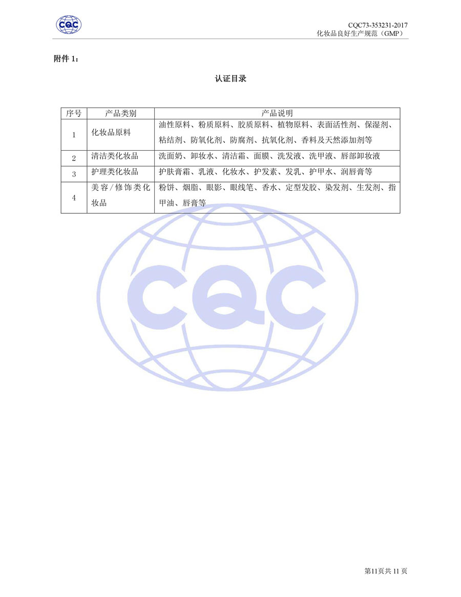 認(rèn)證依據(jù)為美國農(nóng)業(yè)部《Cosmetic Good Manufacturing Practice Guideline》, European Federation for Cosmetic Ingredients (EFfIC)-GMP for cosmetic ingredient,ISO 22716-2007《化妝品良好生產(chǎn)規(guī)范》、CQC73-353231-2016《化妝品認(rèn)證實施規(guī)則》及適用的法律法規(guī)等。