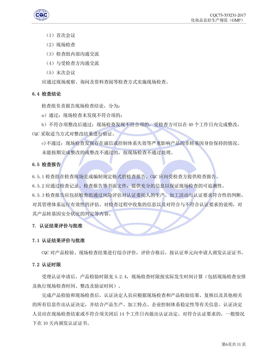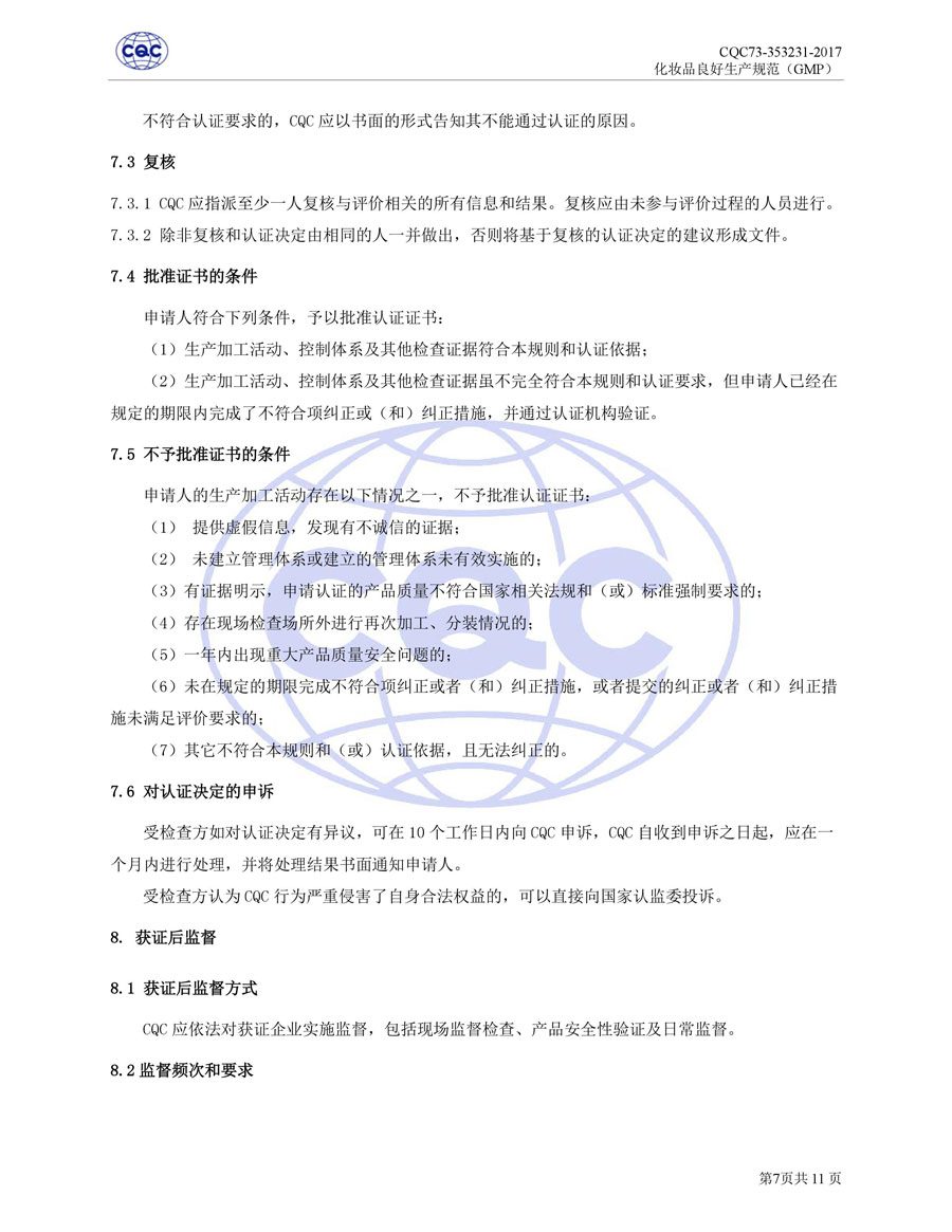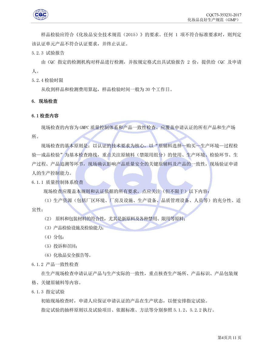認(rèn)證依據(jù)為美國農(nóng)業(yè)部《Cosmetic Good Manufacturing Practice Guideline》, European Federation for Cosmetic Ingredients (EFfIC)-GMP for cosmetic ingredient,ISO 22716-2007《化妝品良好生產(chǎn)規(guī)范》、CQC73-353231-2016《化妝品認(rèn)證實施規(guī)則》及適用的法律法規(guī)等。
